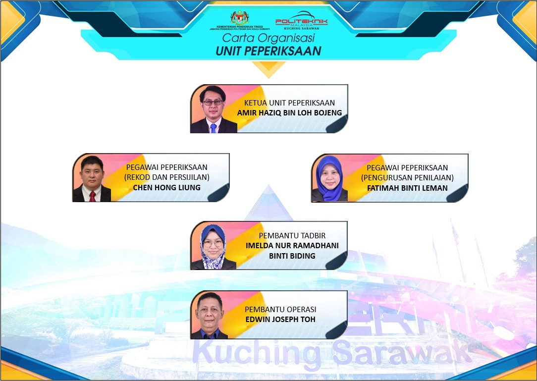 Unit Peperiksaan Politeknik Kuching Sarawak, diketuai oleh Ketua Unit Peperiksaan, dibantu oleh DUA (2) orang Pegawai Peperiksaan dan disokong oleh Penyelaras Peperiksaan Jabatan yang telah dilantik oleh Ketua Jabatan Akademik di setiap Jabatan Akademik.